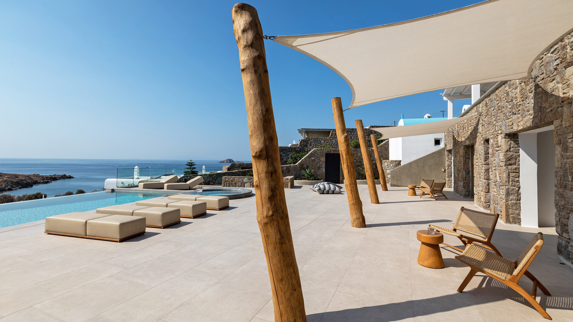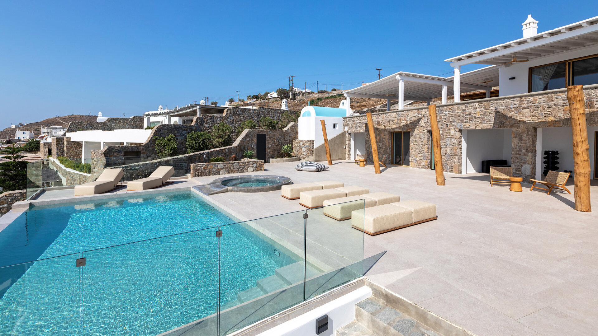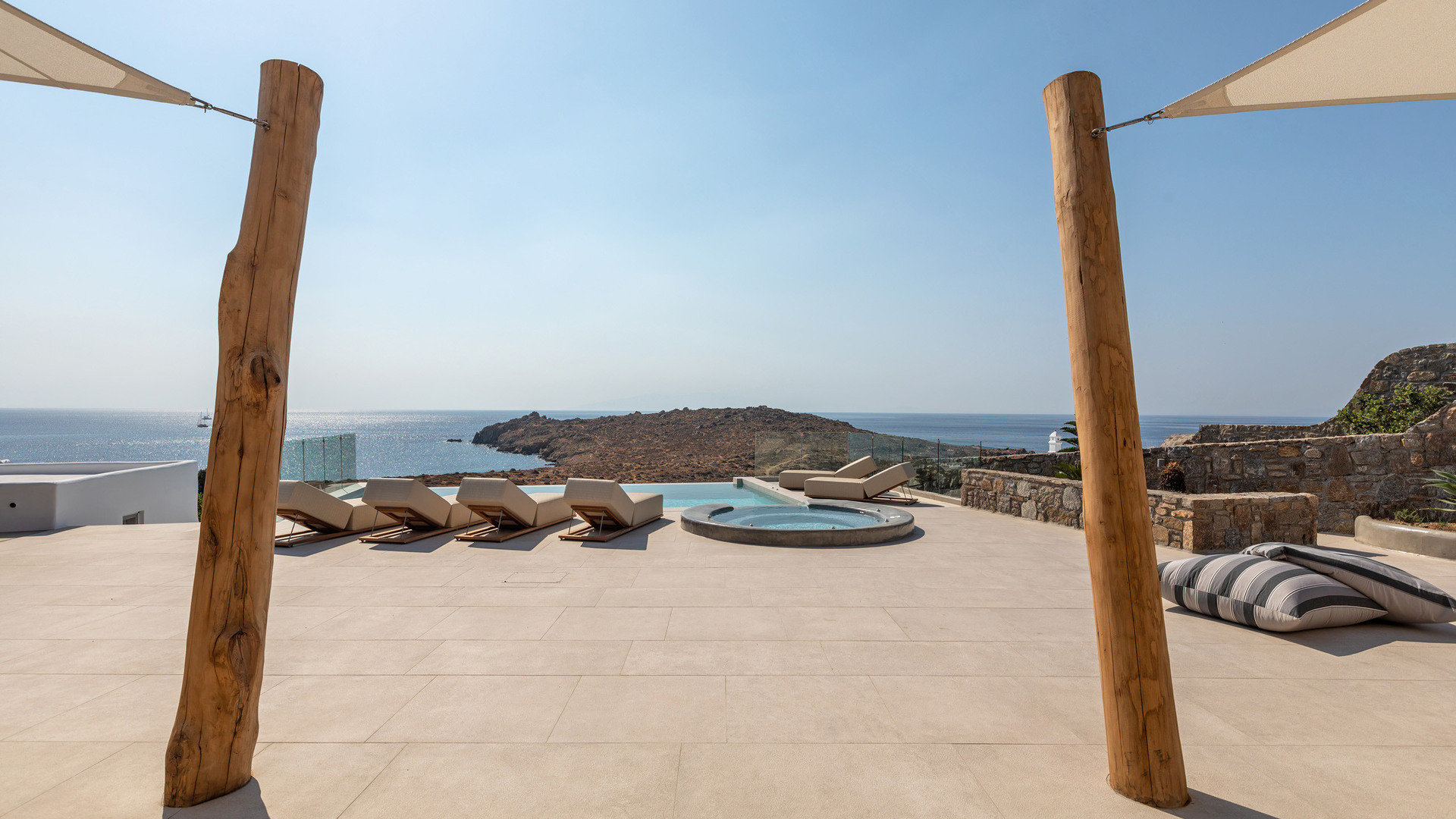 Outdoor living is central to the experience. Two infinity pools face the sea, complemented by three outdoor jacuzzis positioned for relaxation at any time of day. Multiple exterior lounges, an outdoor fireplace and barbecue create inviting spaces for gathering, while an outdoor gym allows for exercise in the fresh island air. Aitherion is an assured, high-end retreat offering privacy, sea views and a relaxed yet refined Mykonos lifestyle.