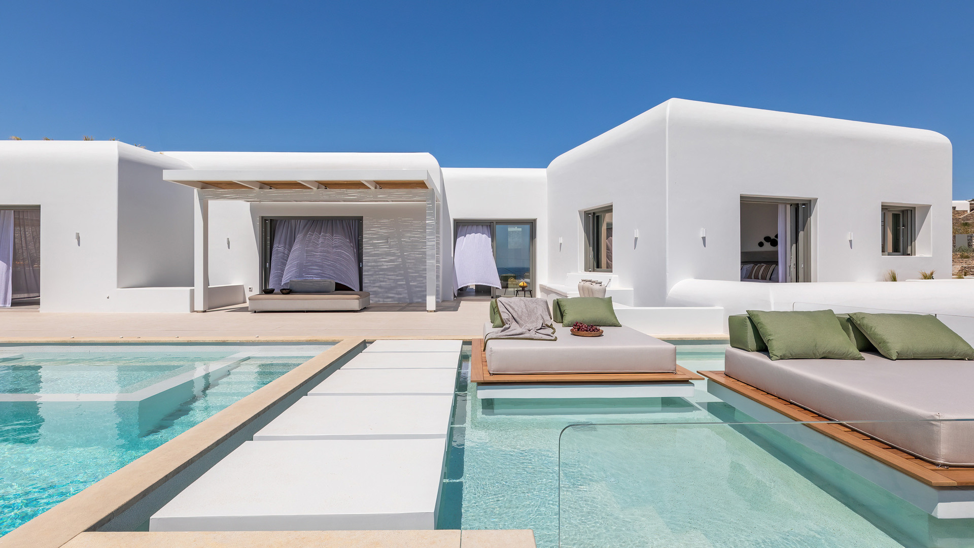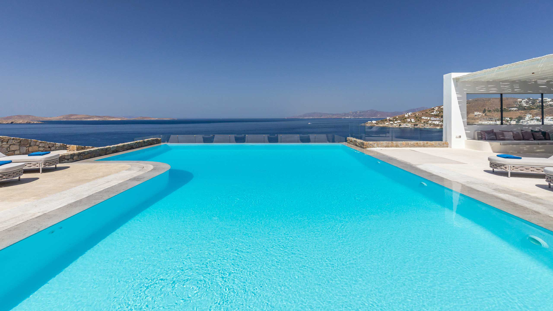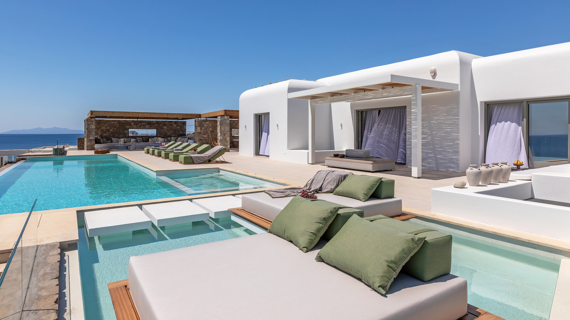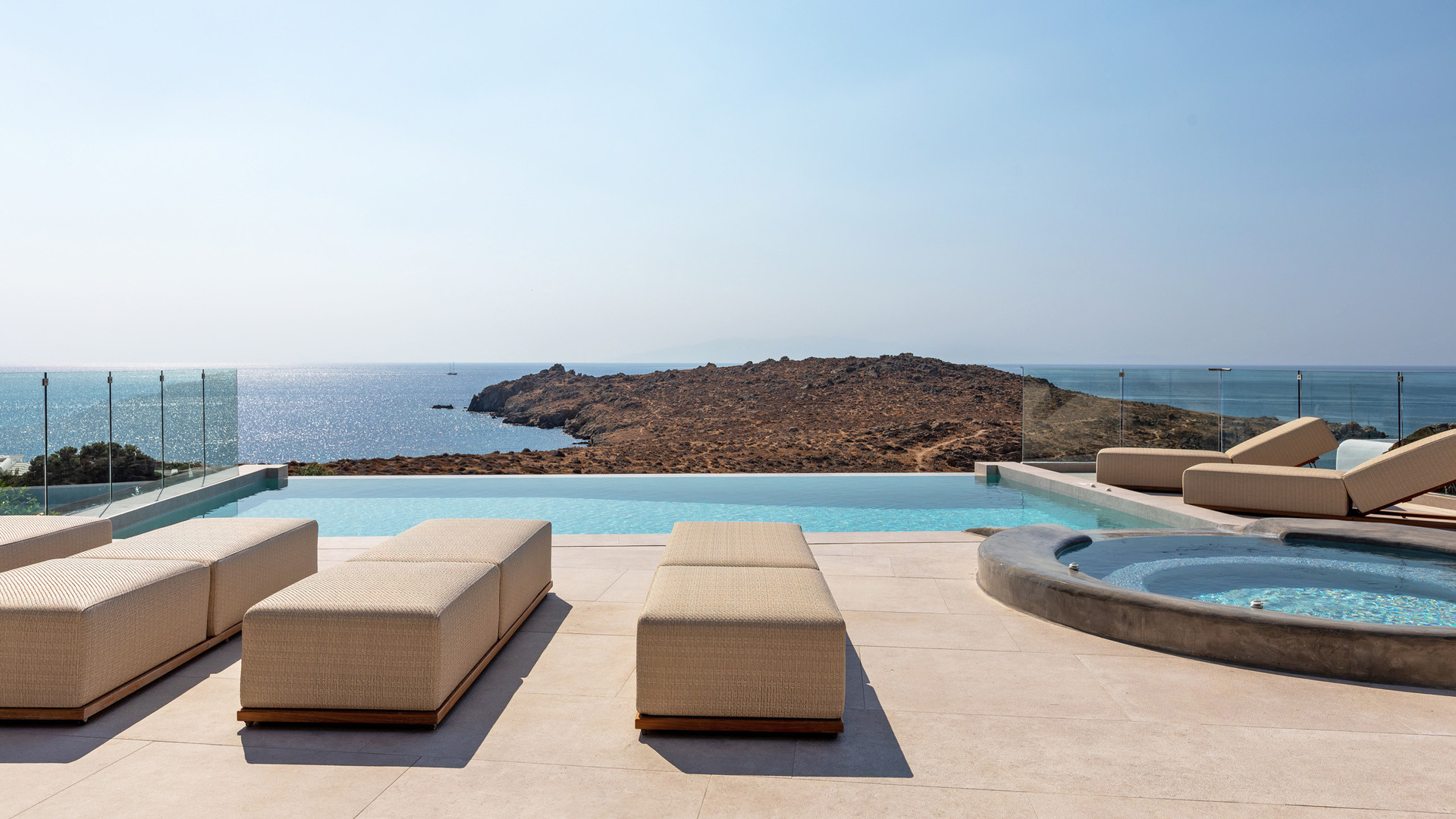 Outdoor living is central to the experience. Two infinity pools face the sea, complemented by three outdoor jacuzzis positioned for relaxation at any time of day. Multiple exterior lounges, an outdoor fireplace and barbecue create inviting spaces for gathering, while an outdoor gym allows for exercise in the fresh island air. Aitherion is an assured, high-end retreat offering privacy, sea views and a relaxed yet refined Mykonos lifestyle.