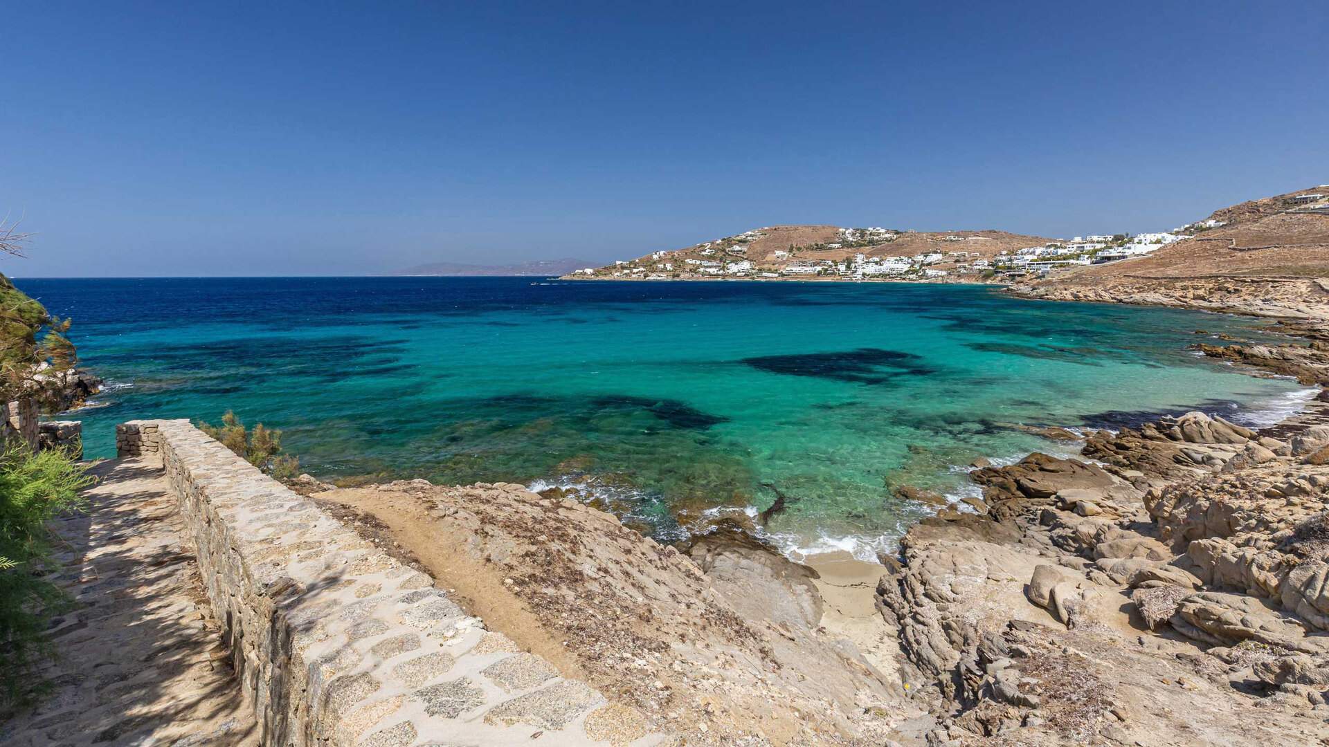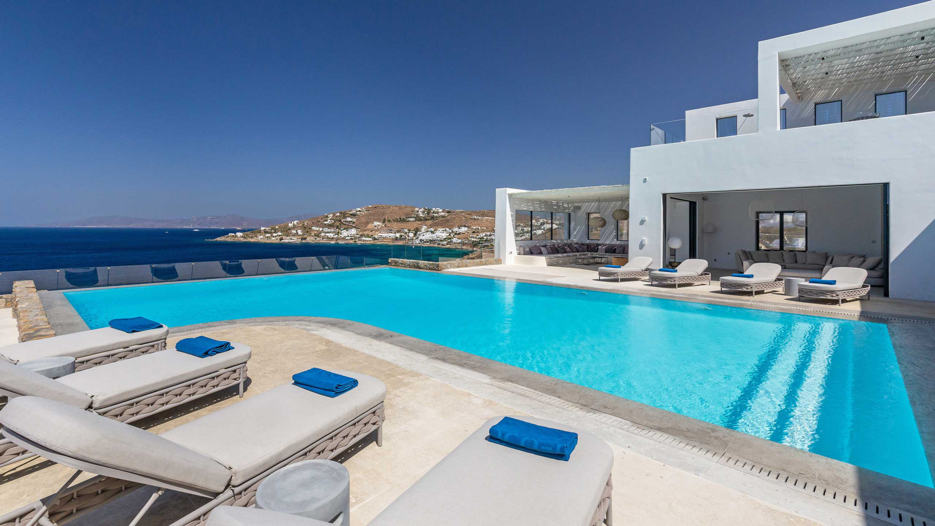 Located in Aleomandra on the western side of Mykonos, the villa is a short drive from Ornos and Agios Ioannis and within easy reach of Mykonos Town. The airport and New Port are both accessible by car, placing beaches, dining and transport links conveniently close while retaining a calm residential setting.