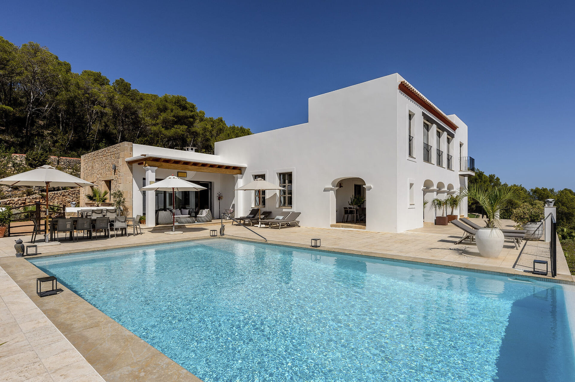Outdoor living is a defining feature. A large infinity pool and outdoor jacuzzi overlook the countryside, while multiple terraces and shaded porches offer spaces for both quiet retreat and sociable gatherings. A substantial poolhouse complex adds over 120 m² of climatized living and dining space, with a secondary kitchen, barbecue area and flexible covered porch that can be enclosed for events or celebrations. Thoughtfully designed and beautifully integrated into its surroundings, Casa Pinar is equally compelling as a luxurious holiday home or an elegant private venue, defined by tranquillity, space and timeless Ibizan appeal.