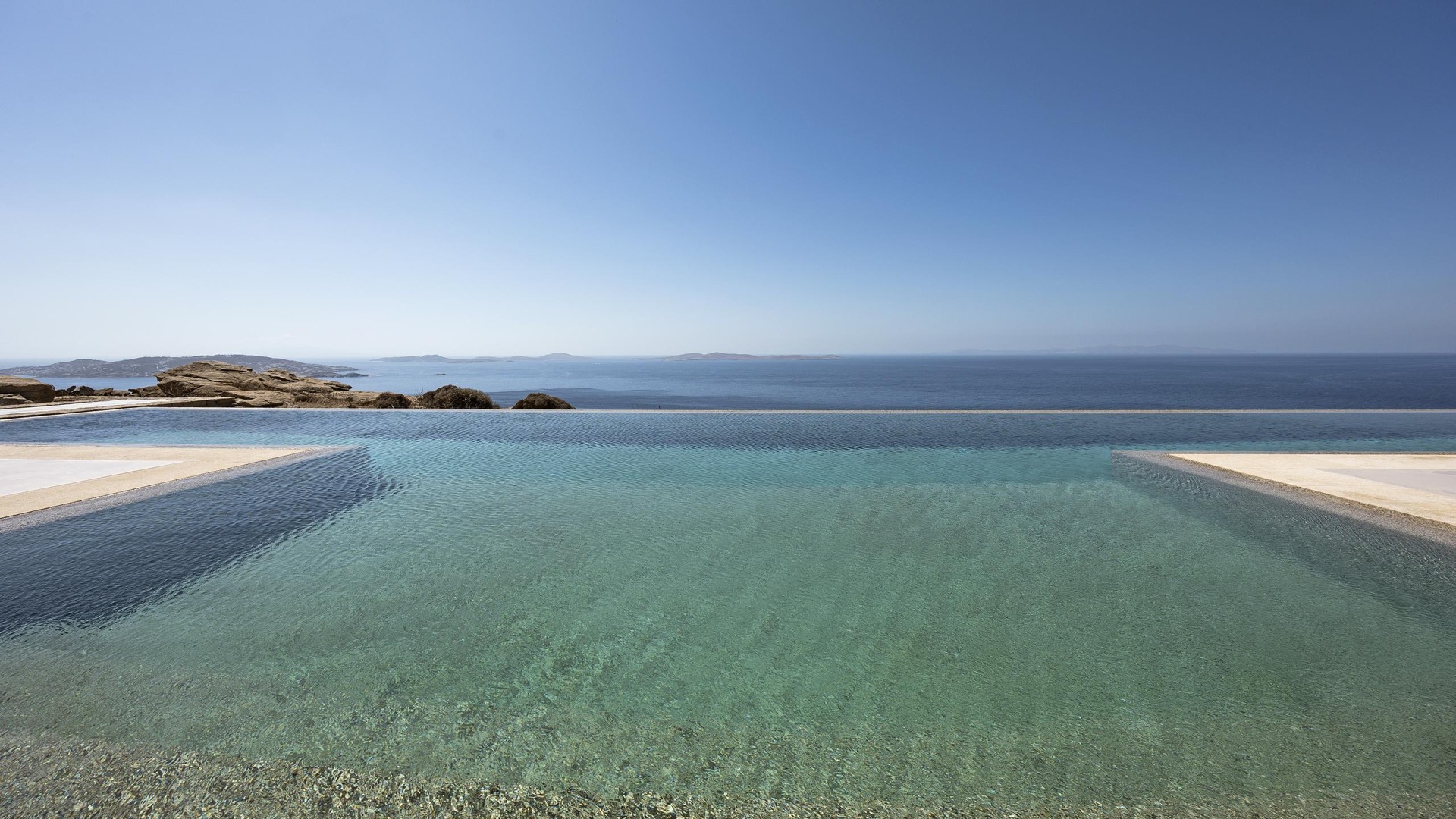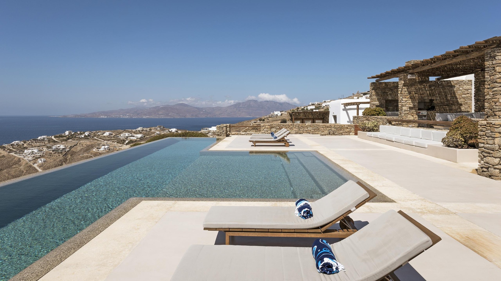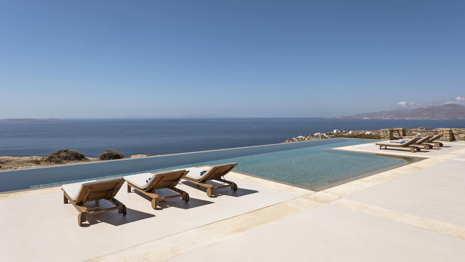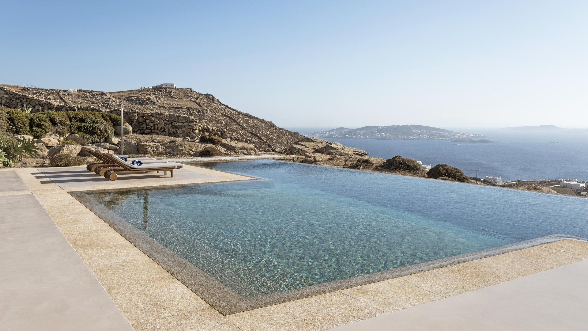 Ivory Villa enjoys open views across the Aegean and a peaceful setting just a short drive from Mykonos Town, the port and the airport. Its elevated position on the hillside of Houlakia, ensures privacy, natural light and clear sunset views.