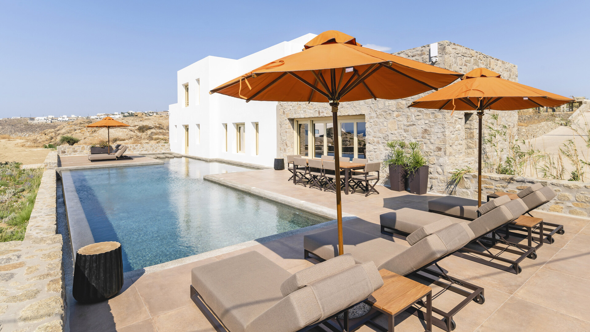 At the heart of the outdoor living space, an imposing infinity pool frames the sea views and sets the tone for long, unhurried days. A generously proportioned dining area and adjacent bar are positioned to make the most of the outlook, with comfortable lounge seating arranged across the main terrace. Villa Lenoir offers a polished and private base for experiencing Mykonos in complete comfort.