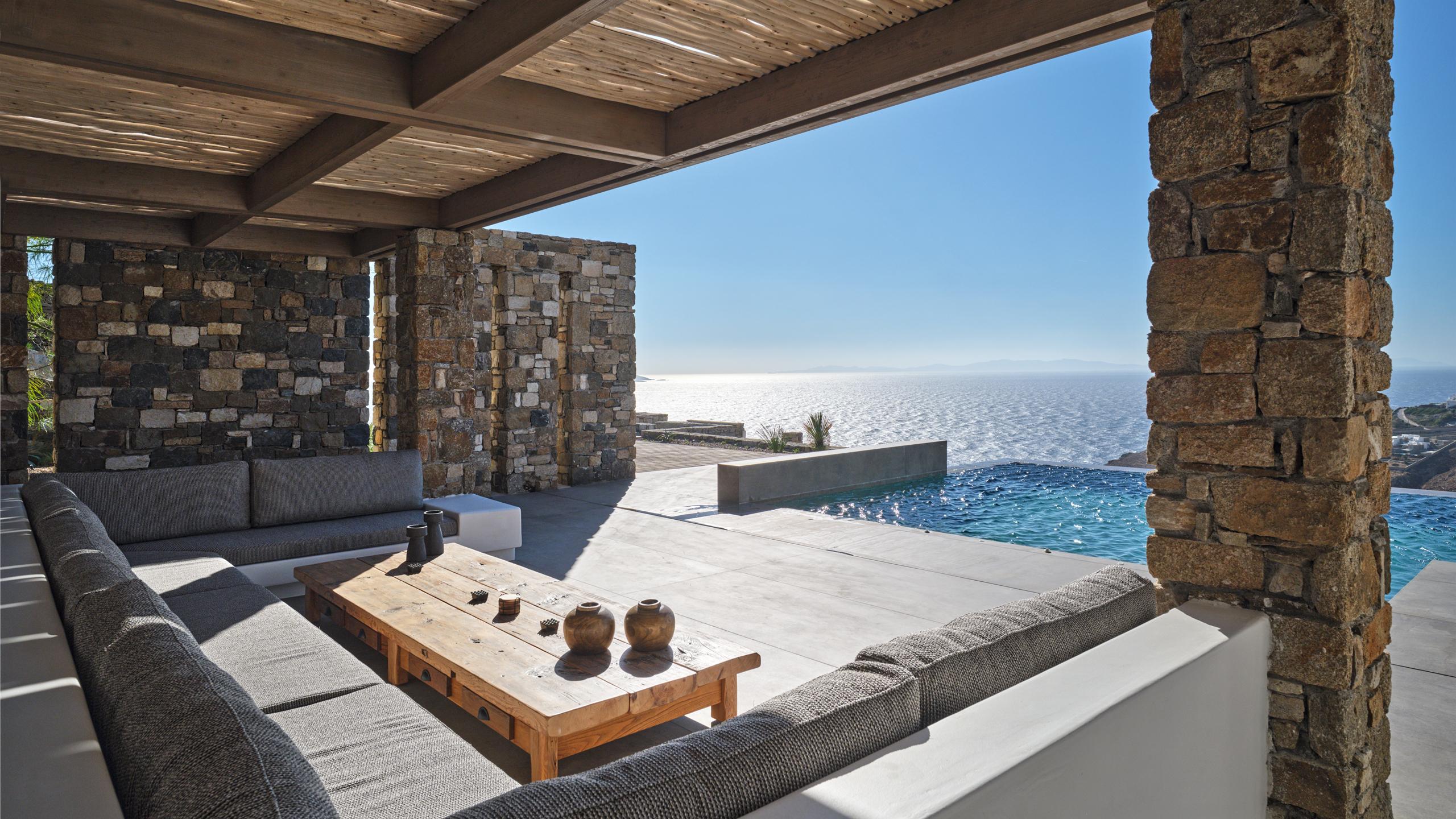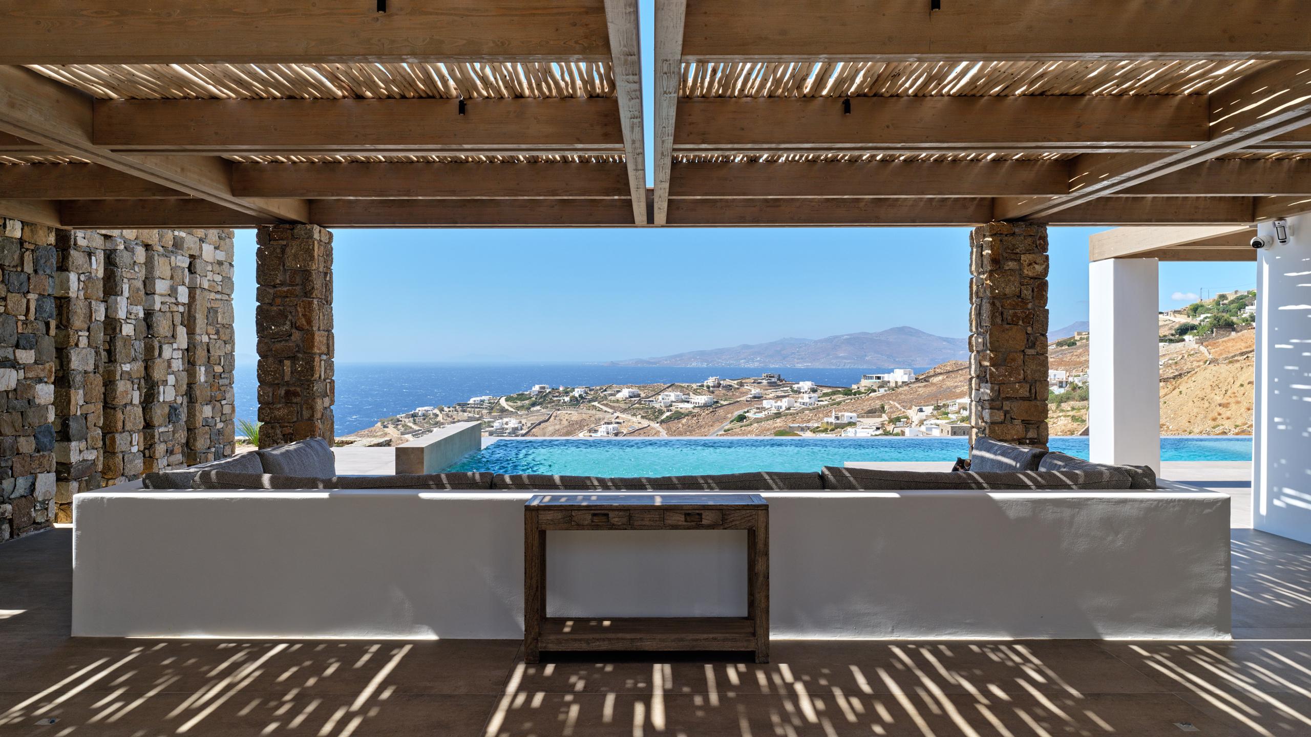 Outdoors, a striking T-shaped infinity pool defines the panoramic terrace, designed equally for lap swimming and relaxed afternoons. The water’s edge appears to merge seamlessly with the Aegean beyond. Generous pergolas shade the lounging and dining areas, fully equipped for long barbecues or sunset cocktails. Villa Maison Dream offers a polished, private setting for those seeking a sophisticated take on the classic Mykonian summer escape.
