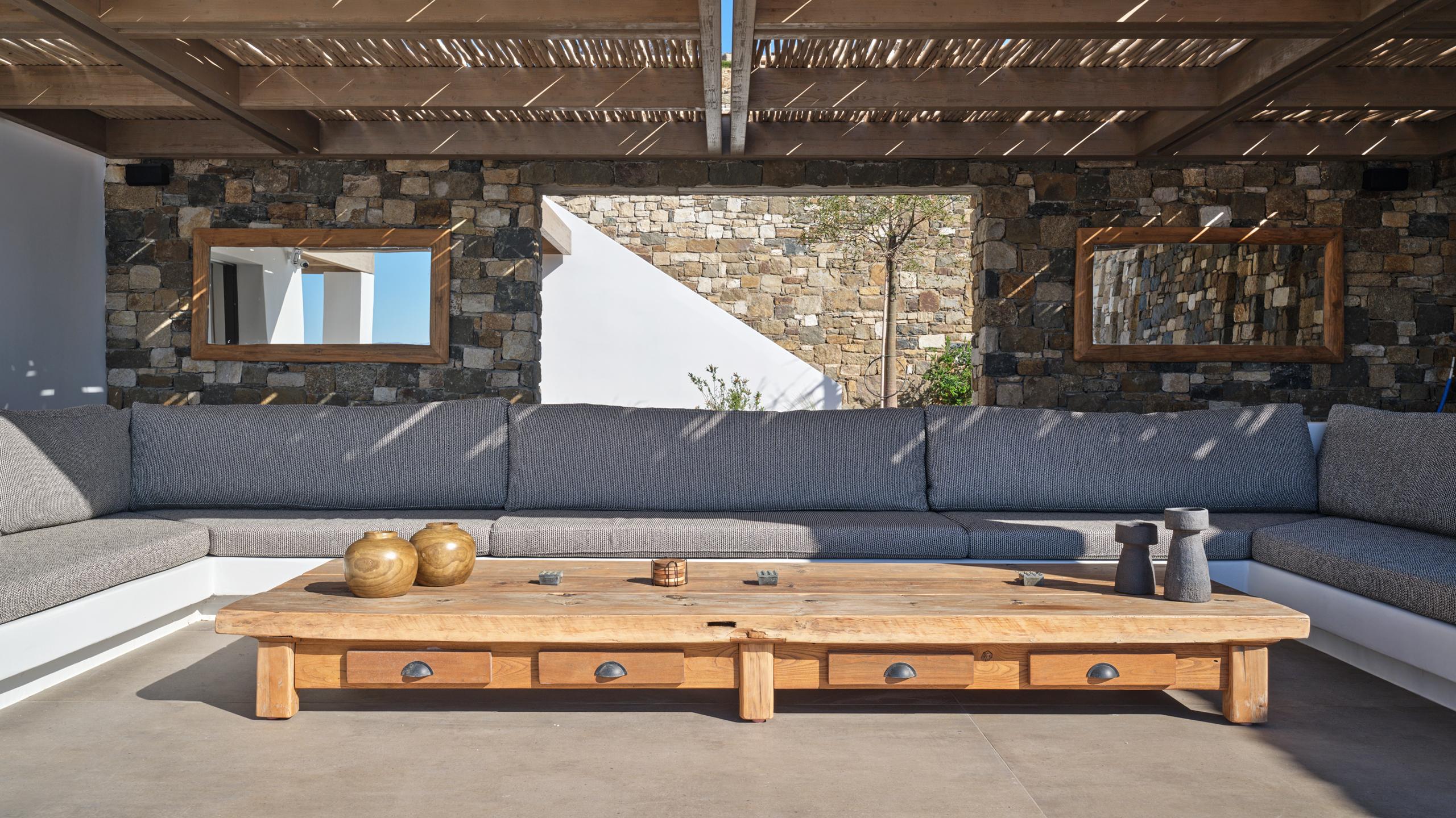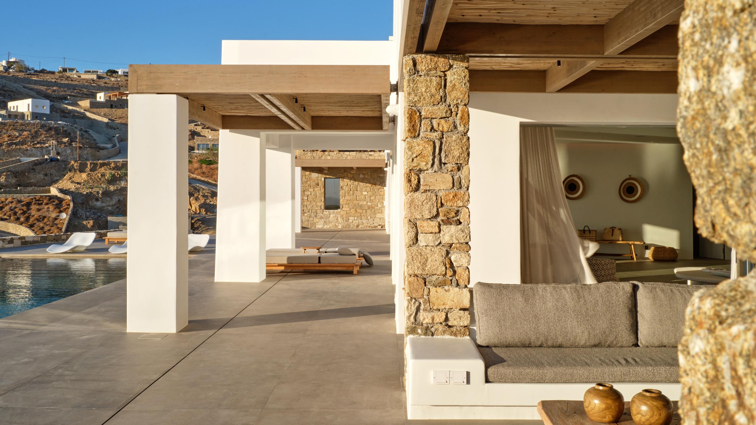 The interiors present a refined interpretation of Mykonian architecture, where traditional cimentogonia flooring meets white-washed wood and sculpted rock or all-white surfaces. Clean lines and fresh design are complemented by state-of-the-art technology, creating spaces that feel both contemporary and rooted in place. The accommodation is thoughtfully arranged, with bedrooms in the main house and additional guest suites with separate entrances, each oriented towards the expansive sea panorama.