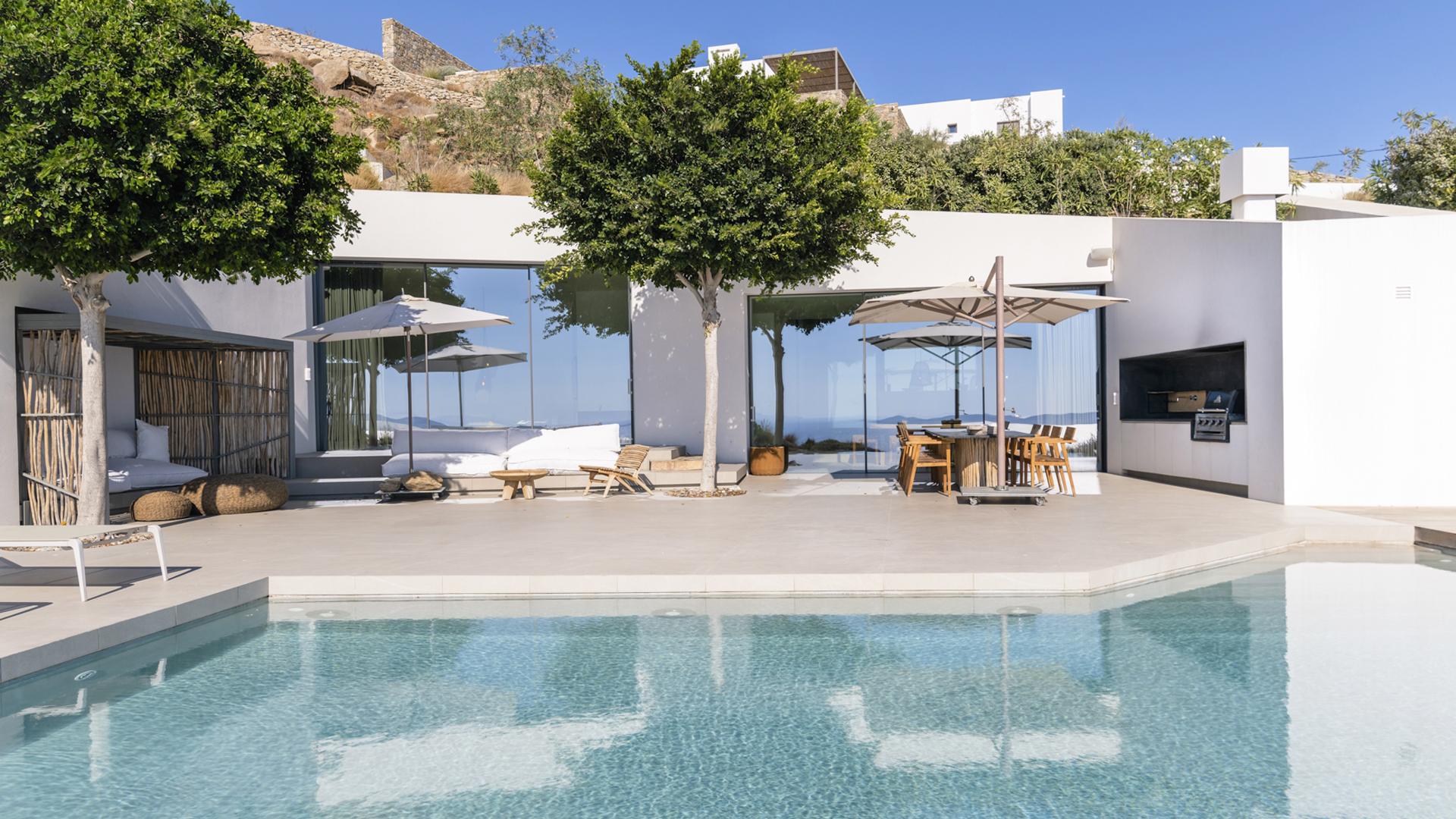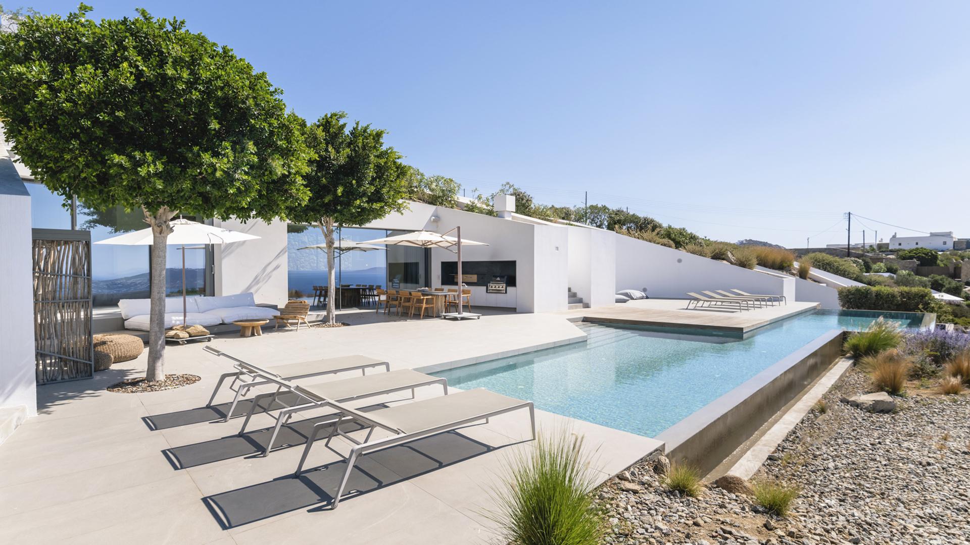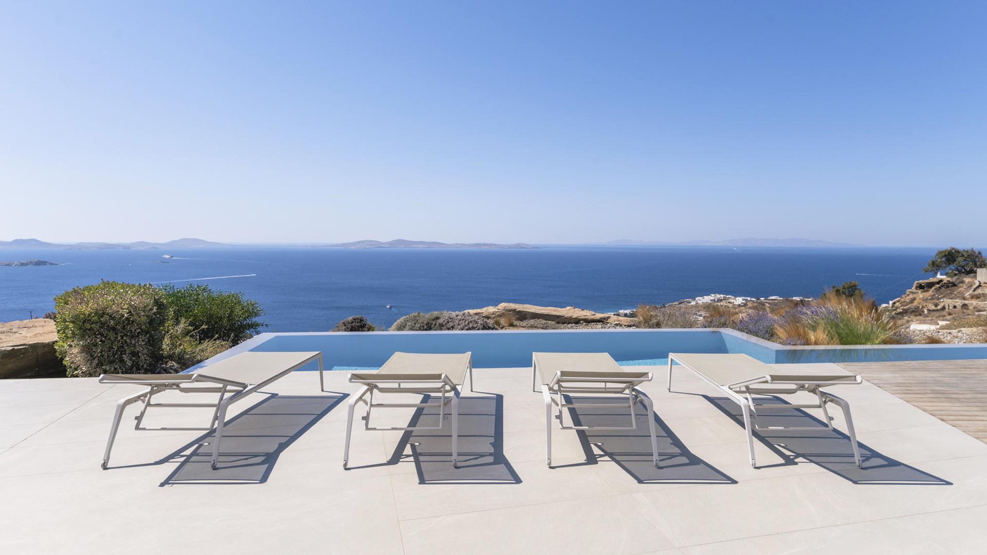 The long infinity pool stretches across the main front terrace, forming the focal point of outdoor life. A generous pergola shelters the dining area and a relaxed lounge with deep sofas, while additional seating areas unfold across different levels of the property, each oriented towards the sea. Ideal for families or groups of friends, Villa Petra offers polished comfort within easy reach of the island’s vibrant heart.