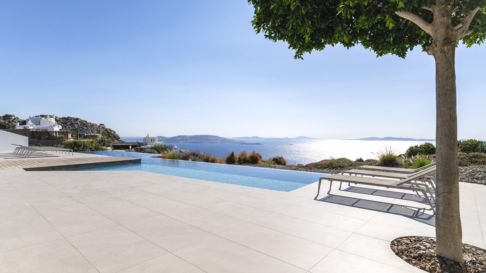 Located in Agios Stefanos 1.6 km from the beach, Villa Aurelia Petra faces west overlooking Mykonos Town and the islands of Delos and Rhenia. The elevated setting captures open sea views and sunsets while remaining within easy reach of the harbour, town amenities and coastal access in this sought after part of Mykonos.