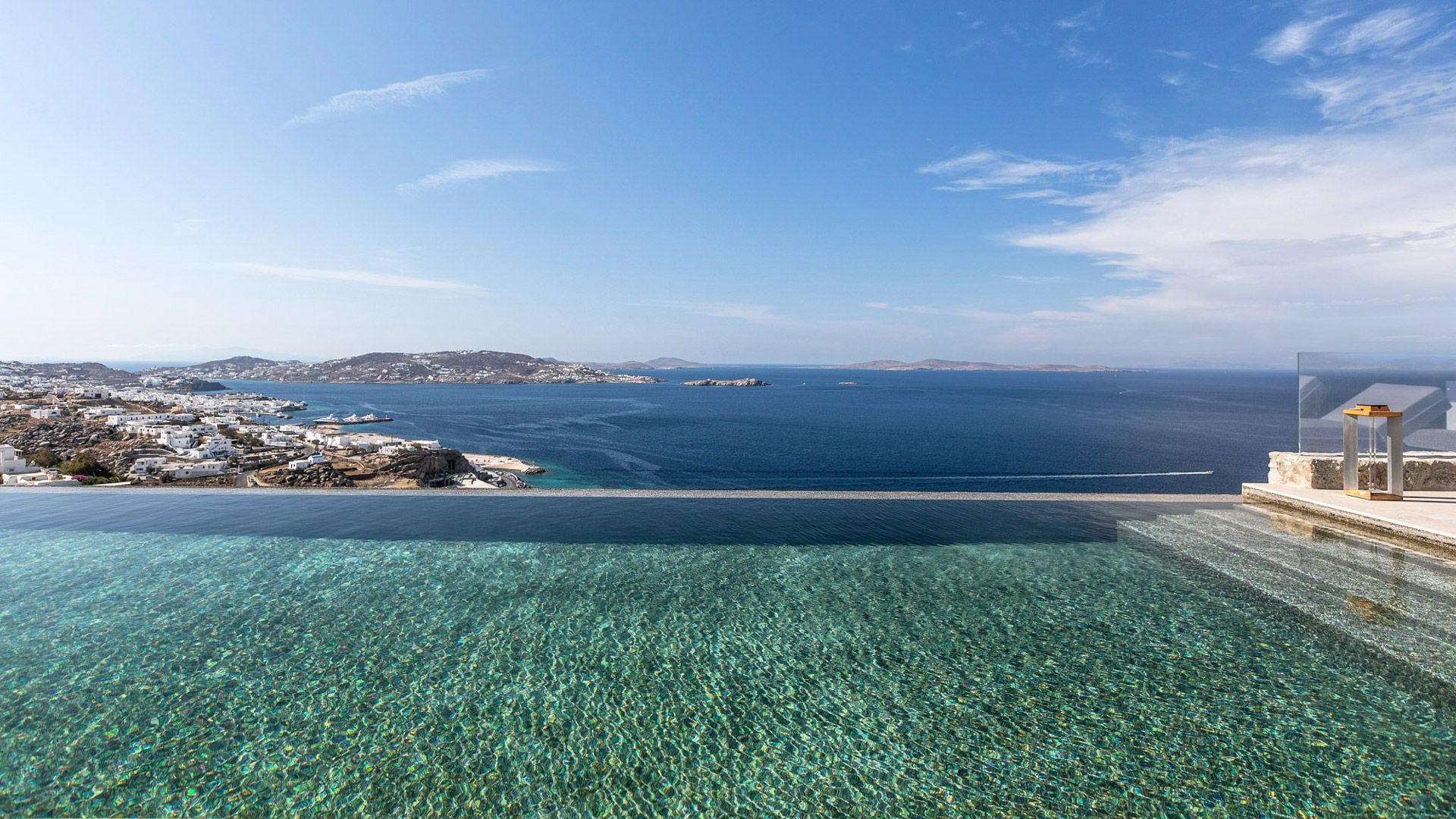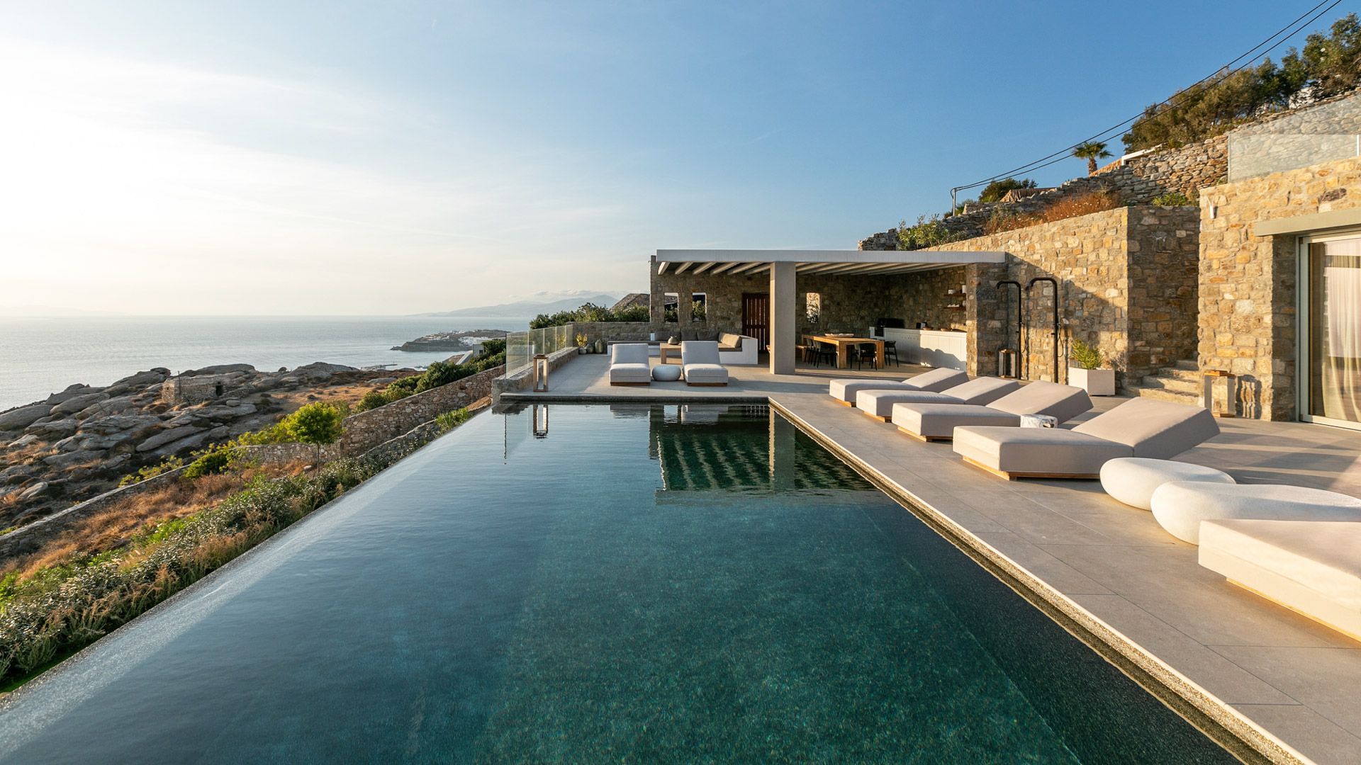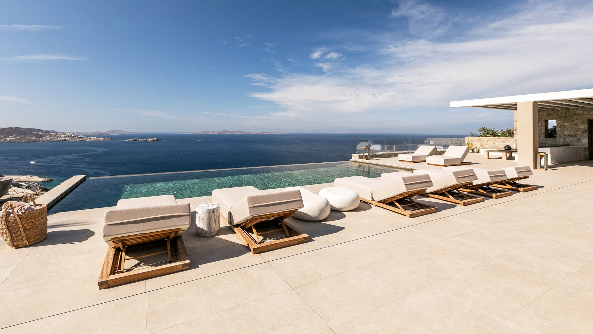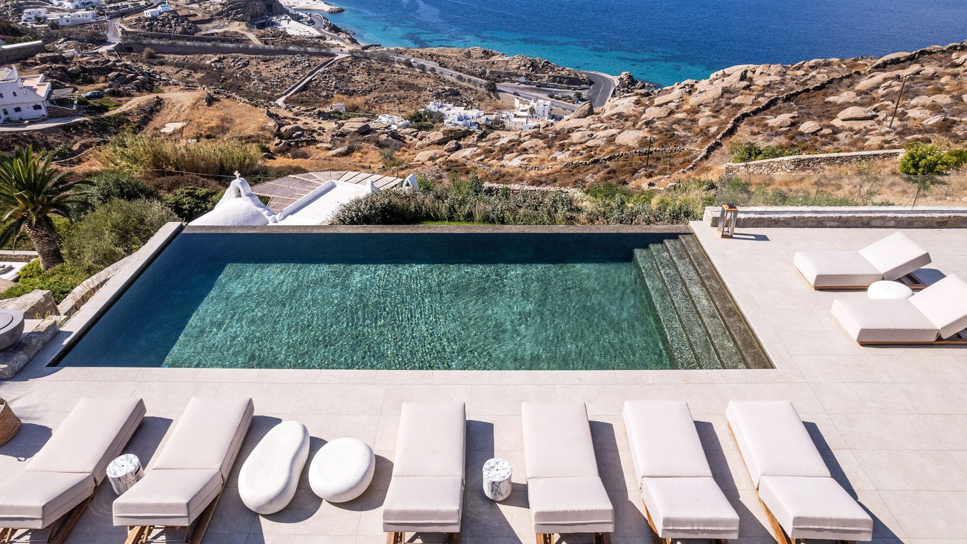 Located in a panoramic north west facing setting above the new port, Villa Rivelle enjoys sweeping views towards the sunset. Agios Stefanos is 2.5 km away while Mykonos Town lies within 3 km, placing the villa close to beaches, dining and the island’s livelier social scene.