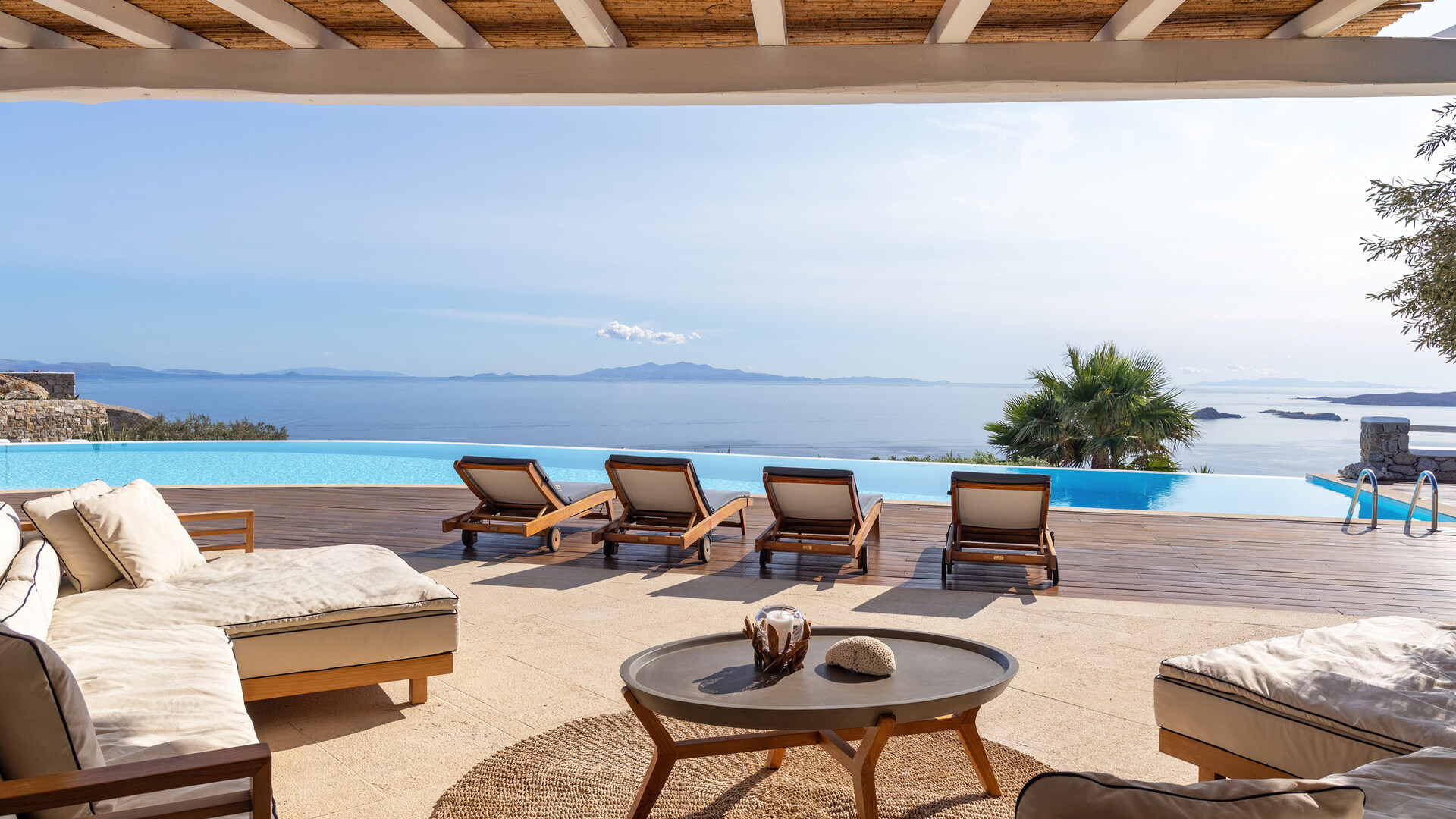 Outdoor living is especially well considered, with two separate dining areas, an attractive wooden deck and a series of furnished lounge spaces that give each part of the house its own sense of place. On the lower level, a charming garden planted with Greek herbs adds another layer of character. With its strong connection to the landscape and close proximity to some of the island’s most sought-after spots, Villa Secret Garden is well suited to stylish summer stays.