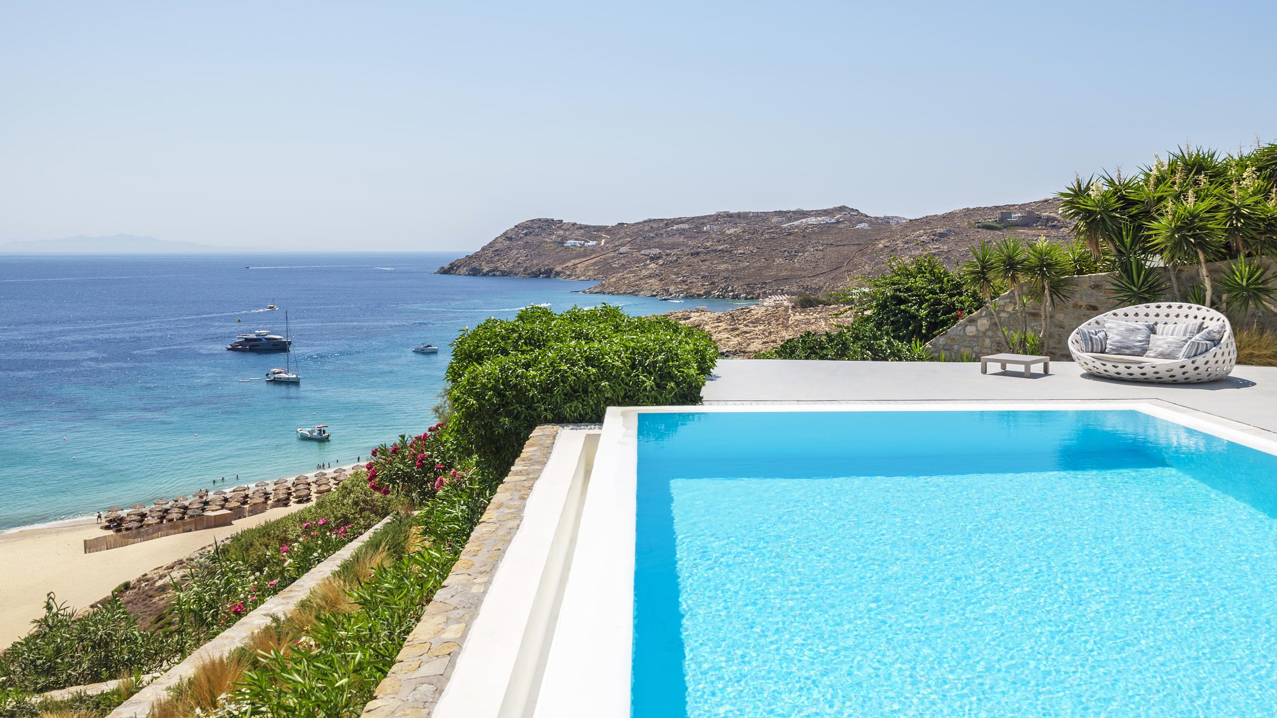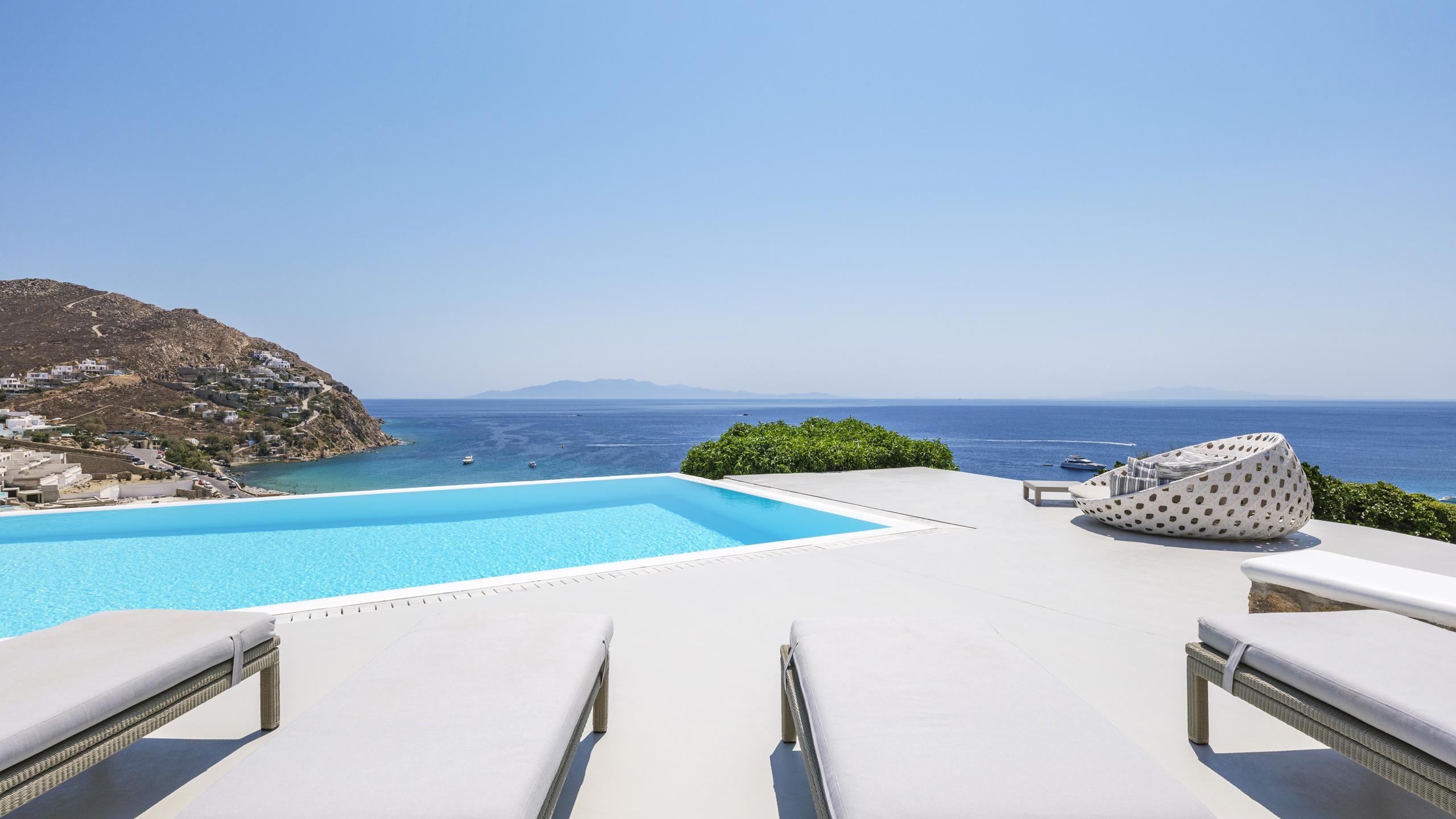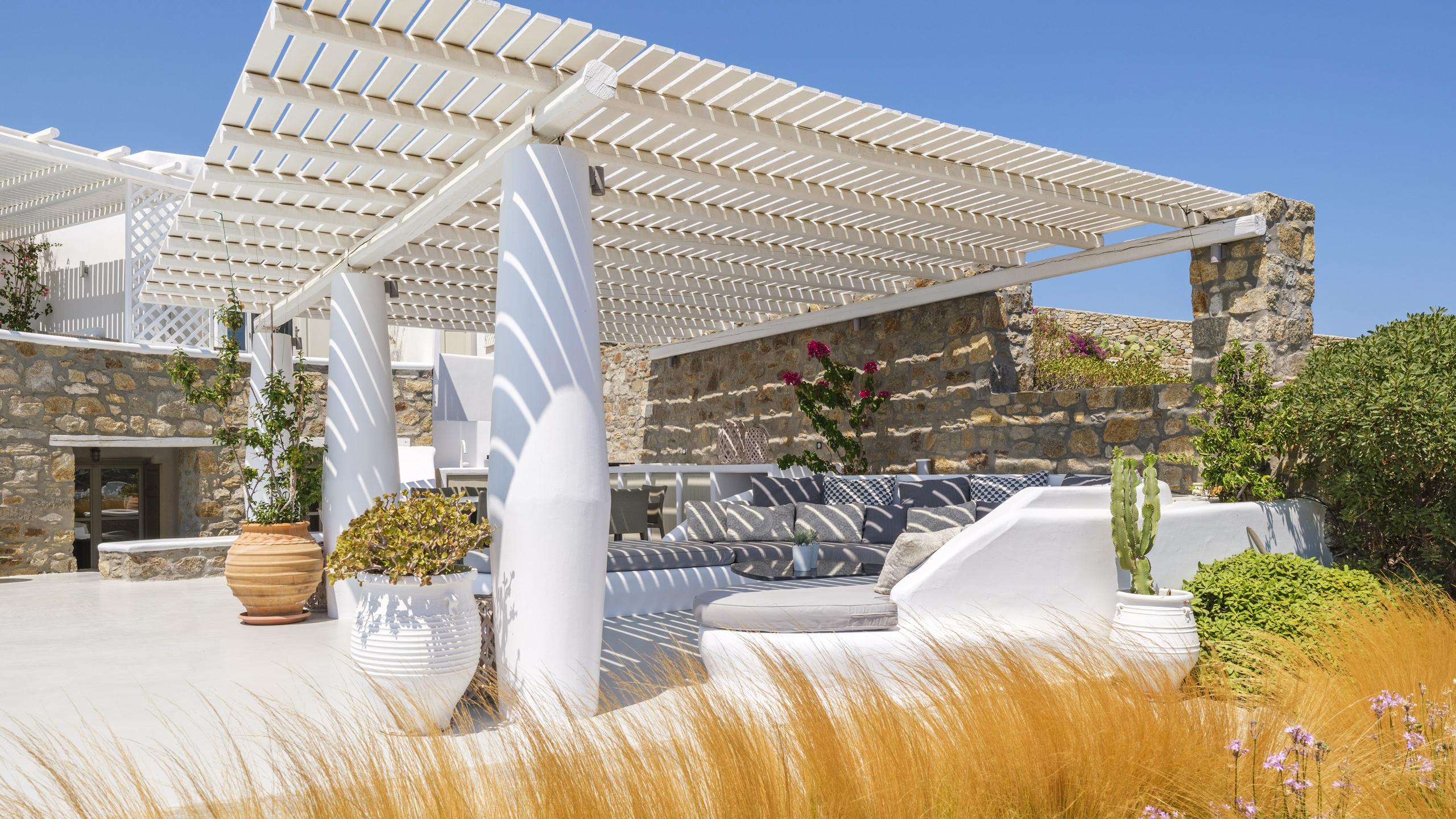 Outdoors, an infinity pool stretches towards the horizon, framed by relaxed lounging areas and a shaded pergola designed for long, unhurried meals. Daybeds and seating areas are positioned to take in the view at every hour, from early morning light to sunset gatherings. Villa Silhouete offers a balanced Mykonos stay, combining quiet beachfront access with easy, sociable outdoor living.