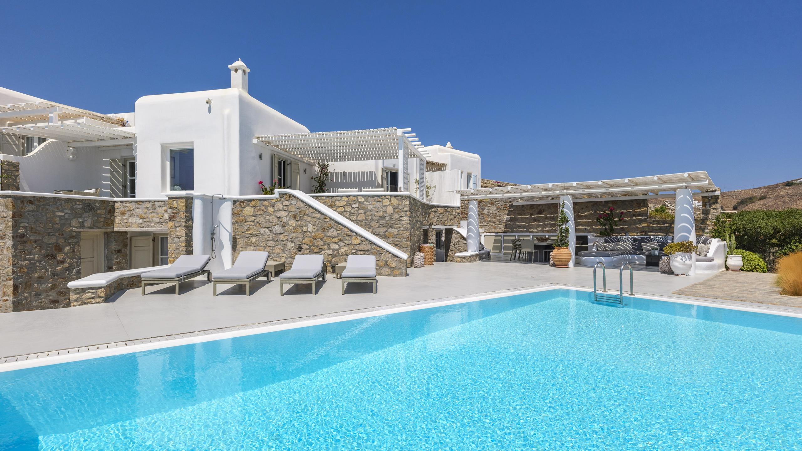 Villa Silhouete enjoys a peaceful hillside setting with uninterrupted views across the Aegean. A private path leads directly to one of Mykonos’ quieter stretches of sand, offering a rare sense of seclusion paired with effortless access to the coast.