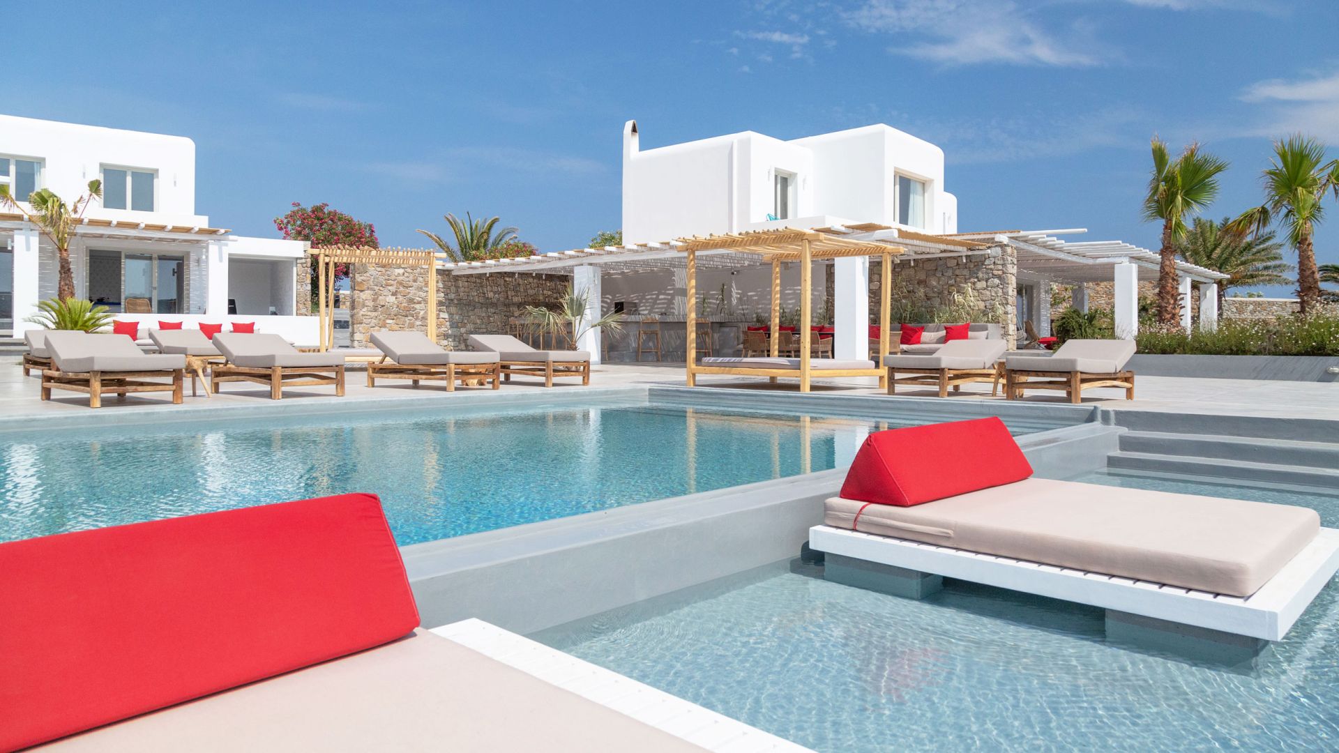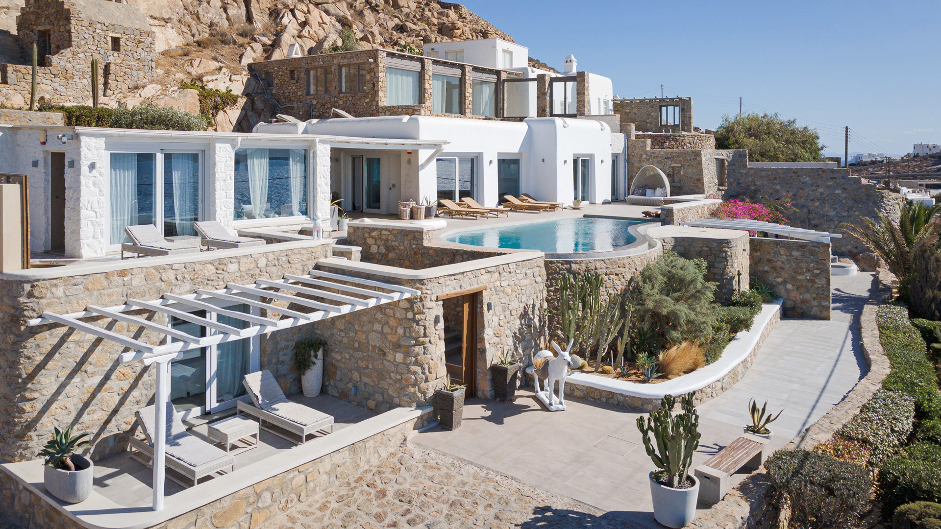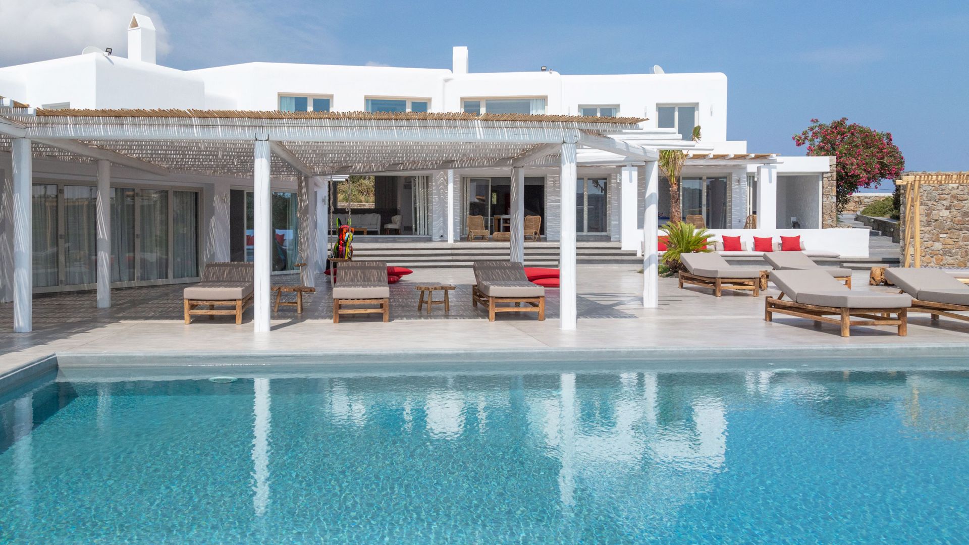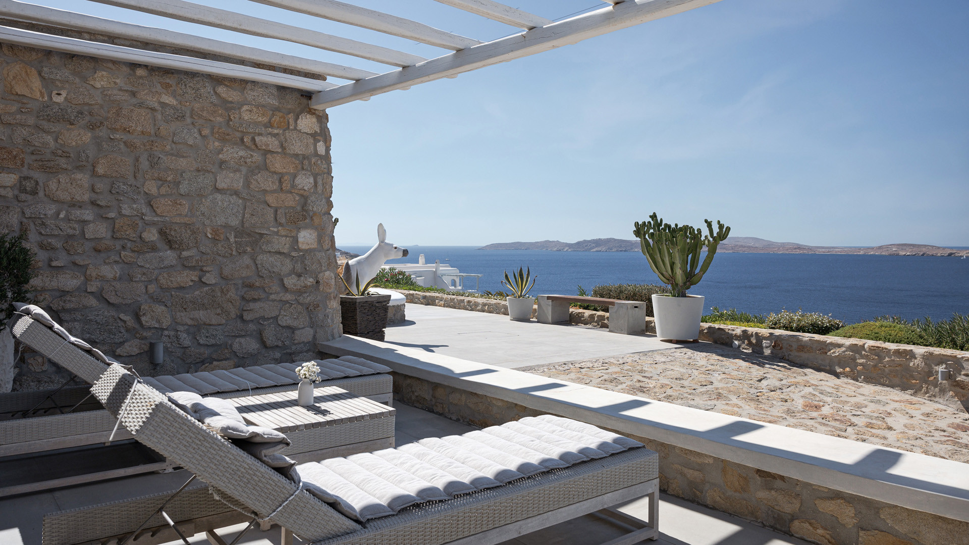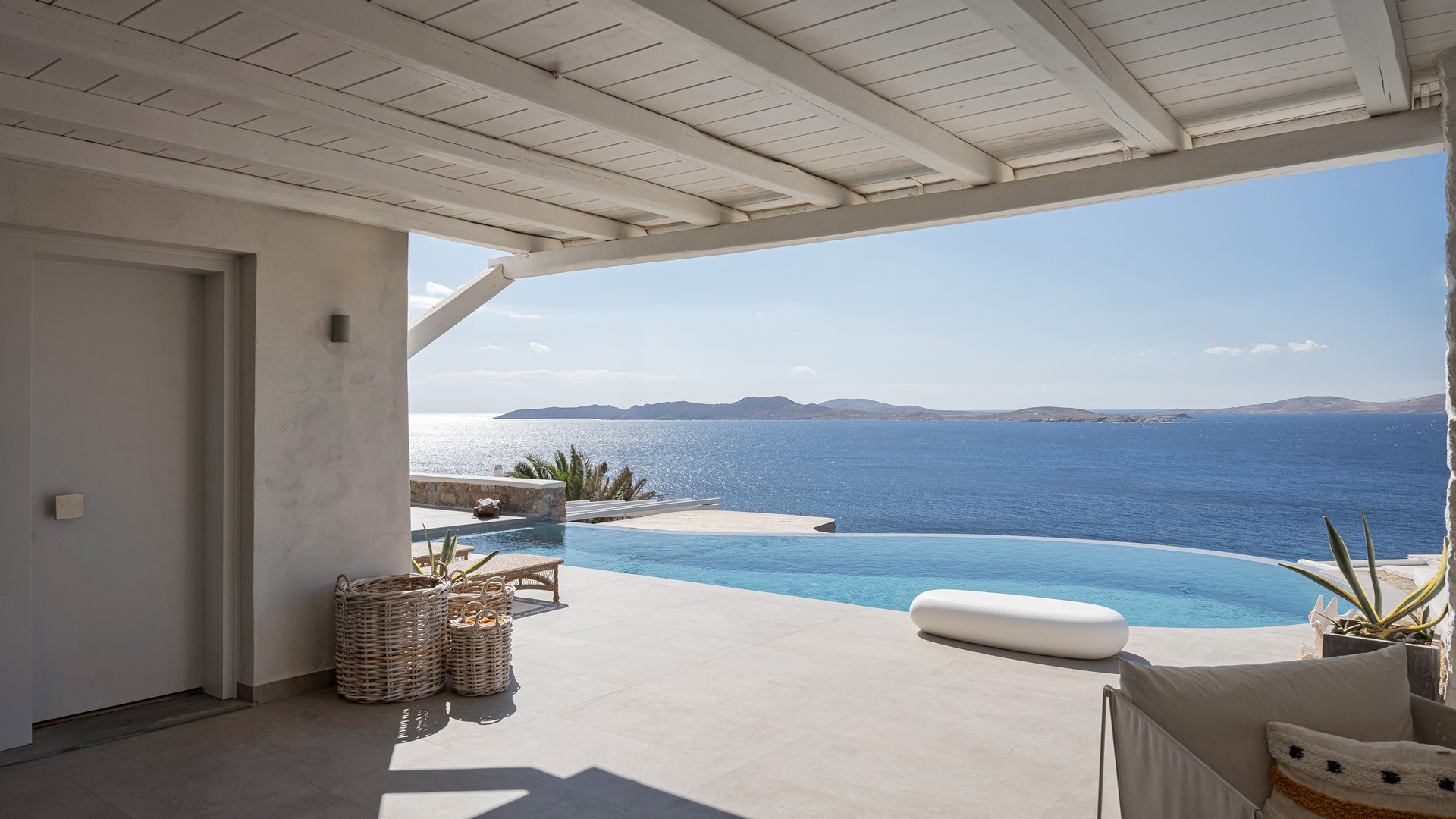 Villa Tranquility enjoys an elevated position in the Pouli area of Mykonos, commanding far-reaching views across the Aegean Sea towards Delos and Rhenia. Oriented to capture the island’s vivid sunsets, the setting combines privacy with convenient access to the southwestern beaches and Chora.