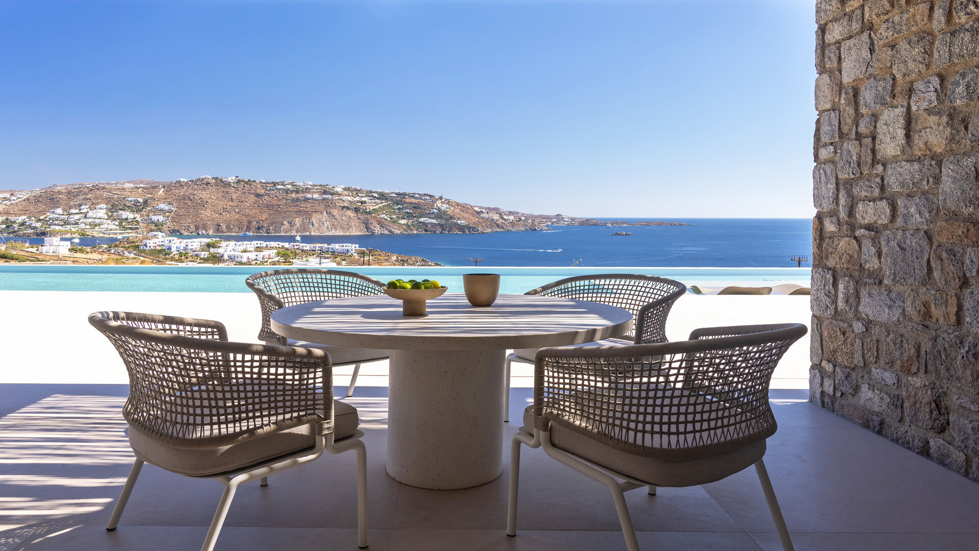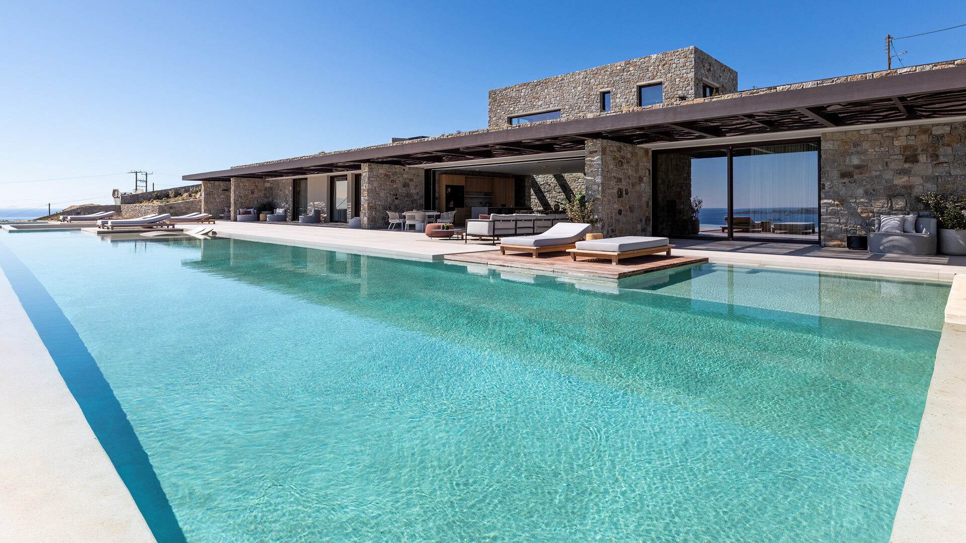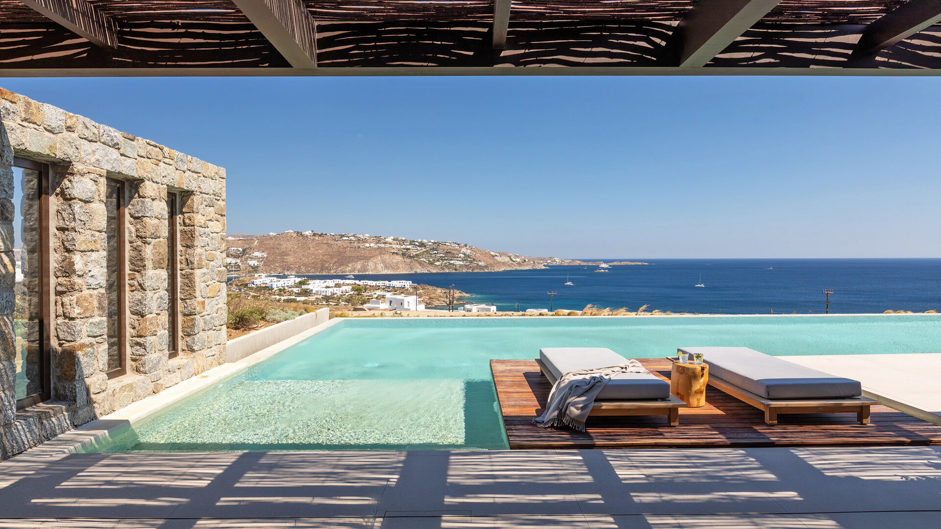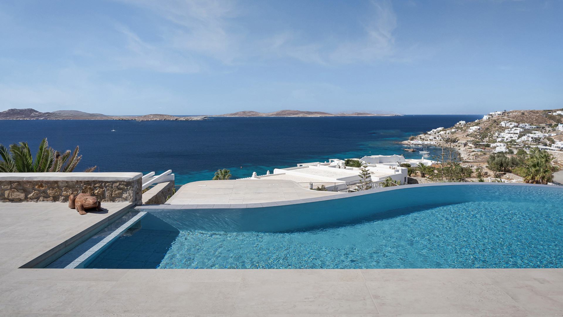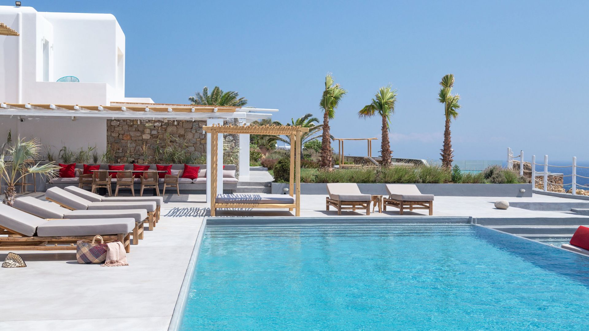 Villa Tranquility enjoys an elevated position in the Pouli area of Mykonos, commanding far-reaching views across the Aegean Sea towards Delos and Rhenia. Oriented to capture the island’s vivid sunsets, the setting combines privacy with convenient access to the southwestern beaches and Chora.